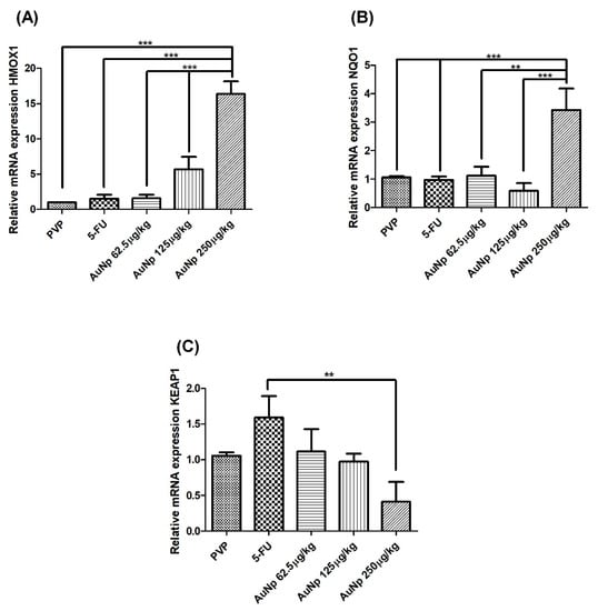 Figure 7. Real-time PCR for heme oxigenasse 1 (HMOX-1) (A); NAD(P)H quinone dehydrogenase 1 (NQO1) (B); and Kelch-like ECH-associated protein 1 (KEAP1) (C). The group AuNp 250 µg/kg increased the expression of the HMOX1 or NAD(P)H genes compared to the 5-FU group. The AuNp 250 µg/kg decreased the KEAP1 mRNA expression compared to 5-FU animals. The results are presented as the mean ± standard error of the mean, (n = 5/group). ** p < 0.001; *** p < 0.0001 (analysis of variance with Tukey’s post-test).