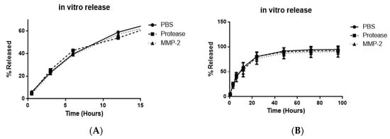 (A) Release points at 0.5, 3 and 6 h, deviation marks have been removed in order to permit its appreciation (B) Cumulative in vitro release (percentage) of TM for 96 h (5 days) with three different release media PBS, PBS with protease (60 ng/mL) and PBS with MMP-2 (60 ng/mL). Each experiment was carried out by quadruplicate.