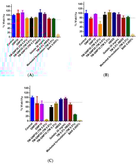 Human corneal cells (HCEpiC) viability at different exposition times (1 h (A), 4 h (B) and 24 h (C)). Negative control: cell culture media; GNP30, GNP20 and GNP10 entail unloaded gelatin nanoparticles at 30, 20 and 10 mg/mL, respectively. TM-GNP30, TM-GNP20 and TM-GNP10 indicate timolol maleate gelatin loaded nanoparticles at 30 mg/mL, 20 mg/mL and 10 mg/mL (equivalent percentage of timolol maleate shown in brackets: 0.9%, 0.6% and 0.3%). HBSS: Hank’s balanced salt solution; gelatin 30 mg/mL dissolved in HBSS (raw material), Timolol maleate 0.5% dissolved in HBSS (raw material), marketed formulation (0.5%) and positive control BAK 0.005%.