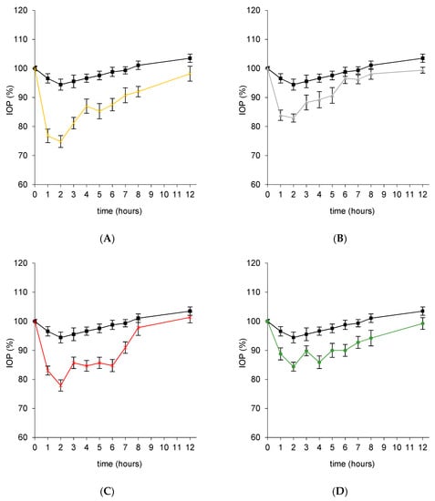 Intraocular pressure (IOP) reduction generated by a single instillation of the following formulations: (A) TM-GNP16 (TM 0.5%), (B) marketed formulation (TM 0.5%, used as a reference), (C) TMGNP8 (TM 0.25%) and (D) TMGNP3 (TM 0.1%). In black, IOP reduction curve of unloaded gelatin nanoparticles used as control.