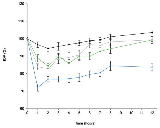 IOP measurements were performed at pre-set times from 0 to 24 h after a single instillation of the different formulations. The empty nanocarrier (non-loaded gelatin nanoparticles (GNP) were tested as control, showing small IOP variations resulting in no significant differences to basal values (p > 0.05). For comparison purposes, studies were also performed with a marketed formulation (0.5%) used as reference (Figure 4).