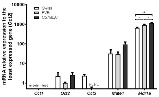 3.1. Expression of Oct1-3, Mate-1 and Mdr1a Transporter Genes in Brain Microvessels of Swiss, FVB and C57BL/6 Mice