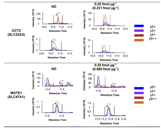 - Kamiie, J.; Ohtsuki, S.; Iwase, R.; Ohmine, K.; Katsukura, Y.; Yanai, K.; Sekine, Y.; Uchida, Y.; Ito, S.; Terasaki, T. Quantitative atlas of membrane transporter proteins: Development and application of a highly sensitive simultaneous LC/MS/MS method combined with novel in-silico peptide selection criteria. Pharm. Res. 2008, 25, 1469–1483. [Google Scholar] [CrossRef]