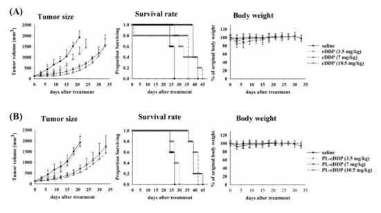 Therapeutic efficacy of free form (A) and liposomal (B) cisplatin (cDDP) on nude mice bearing human S462-TY malignant peripheral nerve sheath tumor (MPNST) tumor. The xenograft mice were subjected to variable doses of cDDP (3.5, 7 and 10.5 mg/kg) via intravenous injection. Left panel, tumor size; Middle panel, survival rate; Right panel, body weight. Data are presented as mean ± S.D. for each group. Four mice were used in the group received 10.5 mg/kg; while five mice were used in other groups.