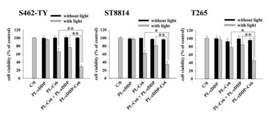 In vitro cytoxicity against S462-TY, ST8814, and T265 MPNST cells. Cells were incubated with different liposomal Ce6 (1 µg/mL), cDDP (2.8 µg/mL) or in combination for 2 h and then subjected to light irradiation (0.1 J/cm2). MTT assay was used to evaluate the cell viability 24 h after light irradiation (* p < 0.05, ** p < 0.01).