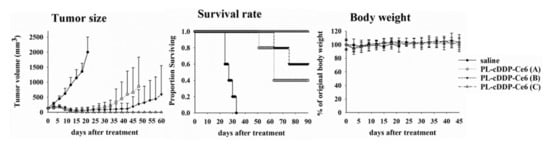 To verify the therapeutic effect of PL-cDDP-Ce6 in vivo, we intravenously injected PL-cDDP-Ce6 containing different doses of Ce6 into the tail vein of the S462-TY xenograft mice with tumor size around 100 mm3. As performed previously, light irradiation (100 J/cm2) was applied onto the tumor at 2 and 12 h, respectively, after drug administration []. As shown in Figure 3, the tumor size increased by time in the saline control group. The mice were regarded as death when the size of tumor was greater than 2500 mm3. The longest survival of the mice in the control group was 33 days (left panel of Figure 3). However, compared to the control group administrated with saline, the levels of tumor regression in mice treated with the dual-effect liposome increased in proportional to the Ce6 amounts in PL-cDDP-Ce6 (3.5 mg/kg cDDP and various amount of Ce6). The Kaplan–Meier survival curve showed tumor-free in two and three out of five mice in the group treated with PL-cDDP-Ce6 containing 1 mg/kg and 1.25 mg/kg Ce6, respectively (middle panel of Figure 3). In fact, tumor-free was found in all mice treated with this dual-effect liposome containing 1.5 mg/kg Ce6 and lived longer than 90 days without tumor re-growth. As reported in the literature and the results in Figure 1A, body weight loss relates to the systemic side effect of cDDP. The body weight of mice did not change significantly in the PL-cDDP-Ce6 treated group during the treatment periods (right panel of Figure 3).