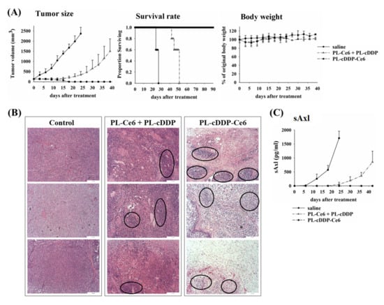 Therapeutic outcome and histological analysis of mice under the impact of PL-cDDP-Ce6 or PL-Ce6 and PL-cDDP in combination. Liposomal drugs (3.5 mg/kg of cDDP and 1. 5 mg/kg of Ce6) were intravenous injected into tumor-bearing mice. Then, light irradiation (100 J/cm2) was applied onto the S462-TY xenograft tumor at 2 and 12 h, respectively, post-drug administration. (A) After treatment, tumor size (left panel), survival curve (middle panel) and body weight (right panel) were recorded and analyzed. The data are expressed as mean ± S.D. for each group (N = 5). (B) S462-TY tumor-bearing mice were treated with saline (left panel), PL-Ce6 and PL-cDDP in combination (middle panel) and PL-cDDP-Ce6 (right panel). Tumor was harvested three days after treatment, then the tissue sections were stained with hematoxylin-eosin. The circles show the inflammatory necrotic tissues. (C) The levels of sAxl corresponding to the tumor size were analyzed against the days after treatment.