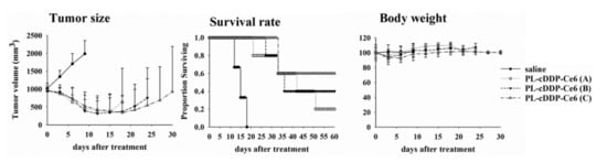 Therapeutical outcomes of PL-cDDP-Ce6 on nude mice bearing S462-TY xenograft tumor with average tumor size of 1000 mm3. A single dose of saline or PL-cDDP-Ce6 was injected into the tail vein of mice in each group (N = 5). The Ce6 dose administrated in mice was 1. 5 mg/kg and the cDDP dose varied, 1.43 mg/kg (A), 2.54 mg/kg (B), and 4.07 mg/kg (C). After drug injection, light irradiation (100 J/cm2) was applied onto the tumor at 2 h and 12 h, respectively. Left panel, tumor size; Middle panel, survival rate; Right panel, body weight. Data are presented as mean ± S.D. for each group.