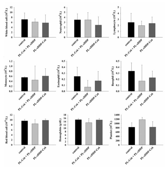 Hematology assay of white blood cells, neutrophil, lymphocytes, monocyte, eosinophil, basophil, red blood cells, hemoglobin and platelets 3 days post the treatment of PL-cDDP-Ce6 or PL-cDDP and PL-Ce6 in combination.