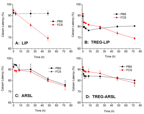 Calcein Latency (%) of vesicles during incubation in PBS and FCS at 37 °C. (A) Liposomes; (B) TREG-LIP; (C) ARSL; (D) TREG-ARSL.