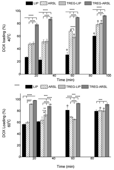 DOX-loading (%) in various types of vesicles by remote loading method at 40 °C and 60 °C. **, *** and **** correspond to p < 0.01, p < 0.001 and p < 0.0001, respectively