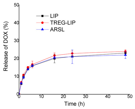 The release of DOX from some liposome types was also studied in order to see if the presence of TREG in the liposomes, or if the structure of ARSL would result in faster leakage of DOX from such vesicle types. As seen in Figure 6, the release of DOX was faster in the first 6 h of incubation, by which approx. 18% of the encapsulated DOX was released; after that, a slower release of the drug was demonstrated up to about 25% at 48 h. The non-released amounts of DOX from all the liposome samples were found in the dialysis sacs after the 48 h period was completed. A similar profile of DOX release was observed for all the liposomes, indicating that TREG or arsonolipids do not modify the capability of the liposomes to retain DOX, at least when DOX is remotely loaded into the vesicles.