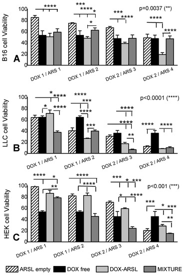 Concerning the effect of free DOX (solution) on the cells, at 1 μM DOX, viability values of 53.4 ± 7.9%, 64.4 ± 2.4%, and 53.6 ± 1.7% were measured for B16, LLC, and HEK cells, respectively. When 3 times higher DOX (concentration) was used, the corresponding viability values for B16, LLC, and HEK were 47.7 ± 6.1%, 36.1 ± 4.8% and 45.2 ± 8.9% respectively, indicating that the B16 and HEK cells were more resistant to DOX (as also demonstrated for empty ARSL) compared to LLC cells; indeed, the viabilities of B16 and HEK cells were not significantly reduced (p > 0.05) when the DOX concentration was increased by 3-fold, oppositely to LLC cells that demonstrated a 56% reduction in viability (p < 0.0001).