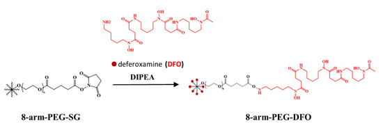 The deferoxamine mesylate salt and the 8-arm-PEG-SG with different molecular weights (20 kDa and 40 kDa) were dissolved in anhydrous dimethyl sulfoxide. The DIPEA (Sigma, Aldrich) was added into the solution under magnetic stirring. The reaction was carried out under nitrogen at 25 °C for 24 h. The purification process was carried out by dialyzing against deionized water at 25 °C for another 24 h. The solution was freeze-dried to obtain the final products.
