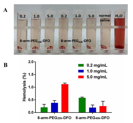 The biocompatibility for the 8-arm-PEG-DFO conjugates were investigated by hemolysis test (Figure 3). The hemolysis character was evaluated by incubating the RBCs dispersion with 8-arm-PEG20k-DFO or 8-arm-PEG40k-DFO. The photos of hemolysis attributed to the conjugates with different DFO contents were shown in Figure 3A. It was observed that the hemolysis phenomenon of all the conjugates was similar to the normal saline, which indicated the 8-arm-PEG-DFO conjugates did not damage the RBC membrane. Subsequently, accurate hemolysis percentages (%) were calculated, and the result is shown in Figure 3B. Even when the content of 8-arm-PEG20k-DFO and 8-arm-PEG40k-DFO was added to the concentration of 5mg/mL (equal to 1.6 mM or 0.8 mM of DFO), the hemolysis percentage of the 8-arm-PEG-DFO conjugate was still below 1.2%. The quite low hemolysis activity indicated that the macromolecular conjugates had excellent biocompatibility for intravenous administration [30,31].