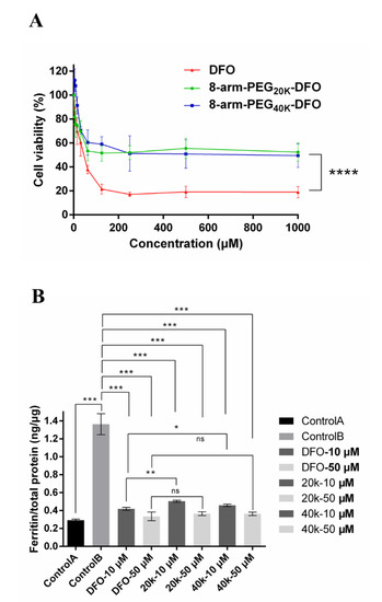 Previous studies indicated the toxicity of DFO [34,35]. Here, cell viability was evaluated to investigate whether the DFO-PEG conjugates could reduce the related toxicity of API. The solutions of DFO, the 8-arm-PEG20k-DFO, or the 8-arm-PEG40k-DFO with different concentrations (3.9 to 1000 μM) were incubated with the RAW 246.7 macrophage cells for 48 h, and the result of cytotoxicity is shown in Figure 5A. There was no significant toxicity in the low content range of DFO (below 31.25 μM) in all investigating groups. While when the equivalent DFO concentration was over 62.5 μM, the macrophages incubated with the 8-arm-PEG-DFO conjugates distinctly showed higher cell viability than that of the free DFO. This phenomenon manifested in the 8-arm-PEG macromolecular conjugates could effectively reduce the cytotoxicity of DFO. Notably, there was no significant difference in cytotoxicity between the 8-arm-PEG20k-DFO and the 8-arm-PEG40k-DFO in the whole concentration range.