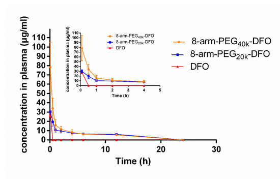To determine the PK properties of free DFO and the conjugates, the concentrations of DFO in plasma were determined after intravenous injection of free DFO, 8-arm-PEG20k-DFO, or 8-arm-PEG40k-DFO in rats. The time-dependent plasma concentration curves are shown in Figure 6, and the main parameters were calculated by the conventional two-compartment PK model (Table 1). It was clearly demonstrated that free DFO had a rapid clearance in the blood stream and became undetectable in the plasma at 30 min, which was consistent with the previous reports (a very short circulation half-life (t1/2)—about 5.5 min in mice) [7,8]. As expected, the conjugates significantly delayed the plasma clearance time of the DFO. The terminal t1/2 of 8-arm-PEG20k-DFO and 8-arm-PEG40k-DFO were 17.58 ± 8.11 h and 10.13 ± 3.31 h, respectively, which were ~190-fold and ~110-fold of that of the DFO respectively. Specially, the volumes of distribution of the conjugates were 0.5 ~ 0.7 L/kg, indicating extracellular distribution. While DFO possessed larger Vd (almost total body water in rats and over 1.35 L/kg in human), the result suggested free drugs tend to distribute throughout the body and might interact with intracellular components, thus leading to cellular toxicity [36,37,38]. As compared with the DFO group, the 8-arm-PEG20k-DFO group showed comparable Cmax, whereas the 8-arm-PEG40k-DFOgroup showed a 2.0-fold increase in Cmax. It suggested that conjugation with 8-arm-PEG40k might hold a toxic risk of a high dose in the plasma, despite of the prolonged t1/2 ability.