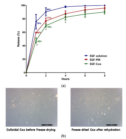 Encapsulation of EGF in LWGA-SA coacervates determined by HPLC was 81% and it was protected from trypsin digestion for 2 h [17]. The in vitro release rate of EGF-Coa was significantly slower than that of EGF solution up to 4 h (Figure 1a). EGF-Coa and EGF-PM were different only up to the 1 h time point by two-sample t-test. The microscopic images of EGF-Coa before freeze drying and those rehydrated after freeze drying appeared the same (Figure 1b).