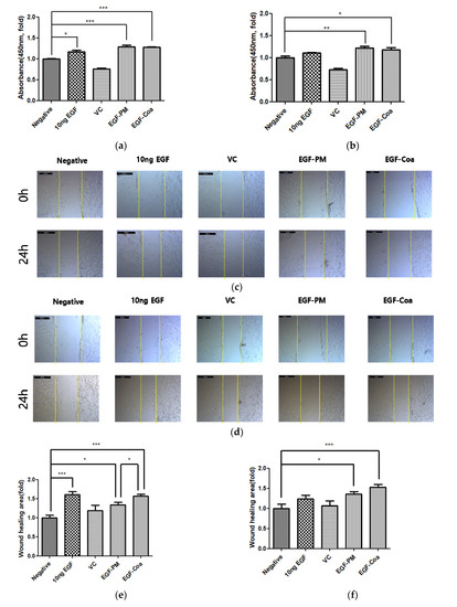 Both EGF-PM and EGF-Coa enhanced the viability of HaCaTs significantly compared to the negative control under normal incubation conditions (Figure 2a). Figure 2b shows the effects of various samples under hyperglycemia conditions. To mimic the hyperglycemia conditions, the HaCaTs were initially incubated for 24 h in media supplemented with 25 mM glucose prior to the cell viability assay by the CCK-8 method. While the activity of EGF solution was lost in hyperglycemia conditions, both EGF-PM and EGF-Coa still showed better viability than the negative control although the significance was less than that in the normal conditions. The representative images of HaCaT scratch wound assay in the normal and hyperglycemic conditions are shown in Figure 2c,d. There were statistically enhanced migration activities of HaCaTs by EGF-Coa treatment compared to the negative group or EGF-solution treatment under normal and hyperglycemic conditions (Figure 2e,f). The EGF solution enhanced the migration significantly compared to the negative control in normal conditions but not in hyperglycemic conditions.