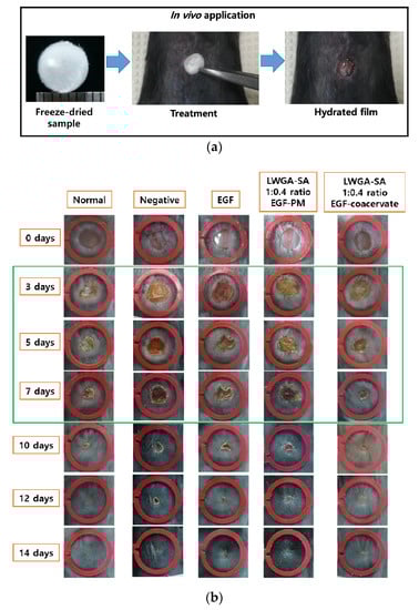 The diabetic mice were divided into five experimental groups (n = 5/group). Under brief anesthesia with isoflurane (Hana pharm, Gyeonggi-do, Korea), the dorsal skin of the mice was shaved and wiped with 70% ethanol. A full-thickness wound (5 mm in diameter) was made on the cleaned dorsal skin of each mouse using a biopsy punch (Kai medical, Oyana, Japan). Group 1 (normal mice) and group 2 (negative control) were given 10 μL distilled water as a control. Group 3 was given 1 μg/10 μL EGF solution. Freeze-dried EGF-PM composed of LWGA-SA (1:0.4) was applied onto group 4. Freeze-dried EGF-Coa composed of LWGA-SA (1:0.4) was applied onto group 5. After applying each freeze-dried sample onto the wounds of groups 4 and 5, DW (5 μL) was dripped to hydrate them. The mice were dosed twice: immediately and three days after wounding. Each mouse was caged separately with food and water. In order to calculate the wound closure rate based on the wound areas, photographs of wounds were taken at different time points after wounding (0, 3, 5, 7 days). The wound healing rate was calculated as follows: