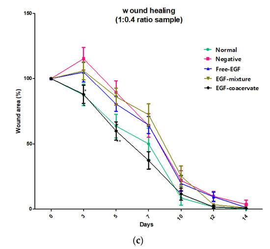 Immediate film formation upon application of the freeze-dried EGF-Coa to the wound site demonstrates its advantage in terms of accurate and easy dosing (Figure 3a). Complete wound closure of all mice groups (normal control and diabetic mice treated or not treated) by day 14 is consistent with other in vivo mice models reported previously (Figure 3b,c) [30,35,36]. While the wound closure in the negative control group of STZ-induced diabetic mice was slower than that in the normal mice, the EGF-Coa significantly accelerated wound closure in the STZ-induced diabetic mice compared to all the other groups up to 7 days. Enhanced wound healing rate during the earlier phase in mice can be beneficial because it can lead to less chance of complication when translated to clinical application. The in vivo efficacy of wound healing correlates with the in vitro activity in that EGF-Coa was better than the negative or EGF solution groups. However, statistically better in vivo wound healing of EGF-Coa compared to EGF-PM cannot be predicted from the keratinocytes’ viability or migration assay results shown in Figure 2. Notably, the better activity of EGF-Coa compared to the EGF-PM was observed on the migration of HDF in our previous study. These conflicting in vitro and in vivo results are another example of complex mechanisms for chronic wound healing.