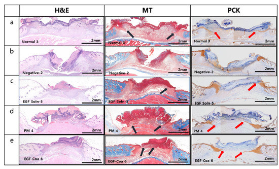Histological images of wound beds with hematoxylin and eosin (H&E), Masson’s trichrome (MT), and pan-cytokeratin (PCK) staining. (a) Normal (non-diabetic mice), (b) Negative (diabetic mice) treated with PBS, (c), (d), and (e) Diabetic mice treated with EGF solution, EGF-PM, and EGF-Coa. Black (MT) and red (PCK) arrows indicate the pointed fronts of horizontal migration of keratinocytes along the surface of newly formed granulation tissue.