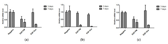 There was no death or significant changes in the body weight during the experiment except two mice which had lower body weight than the others at dosing and died at 4 and 7 days after dosing, respectively. The body weight data are shown in the Supplementary Materials (Table S1). There were no significant differences among the groups in the levels of proinflammatory cytokines IL-1b, IL-6, and TNF-α on day three (Figure 5). The cytokines levels in the EGF-PM and EGF-Coa groups on day seven were lower than those on day three, whereas the negative group did not show significant changes between day three and day seven. The EGF-Coa group appeared to show the lowest level of all three cytokines on day seven, although a statistical analysis was not feasible due to the limited number of samples.
