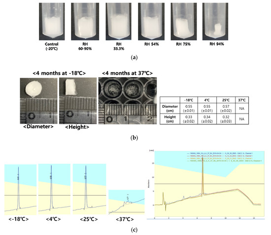 Freeze-dried samples stored above 33% relative humidity (RH) showed physical (Figure 6a) and chemical changes after two weeks of storage at room temperature (Table 4). There were no changes in the appearance of the freeze-dried EGF-Coa after four months of storage at −18, 4, and 25 °C except at 37 °C (Figure 6b). The RP-HPLC showed massive degradation peaks of EGF-Coa from 37 °C storage, whereas samples stored at lower temperatures appeared intact (Figure 6c). In vitro release patterns of various storage temperatures were consistent with the findings from the HPLC analysis (Figure 6d).