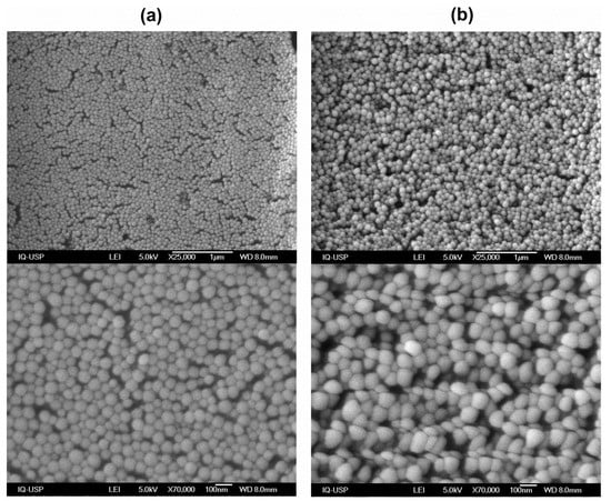 PMMA/QAC NPs’ morphology, size, and homogeneity were assessed by SEM. Two different PMMA/QAC NPs were synthesized and observed after drying under SEM (Figure 1). The QAC was DODAB (Figure 1a) or CTAB (Figure 1b). Both syntheses employed 0.4 M MMA, 2 mM QAC, 0.0036 g AIBN and 1 mM NaCl in 10 mL of reaction mixture. The NPs were spherical, displayed a narrow size distribution and were homo dispersed. PMMA/DODAB and PMMA/CTAB mean diameters after drying (D) were obtained for at least 100 particles from the ImageJ software as 56 ± 7 and 85 ± 11 nm, respectively (Figure 1).