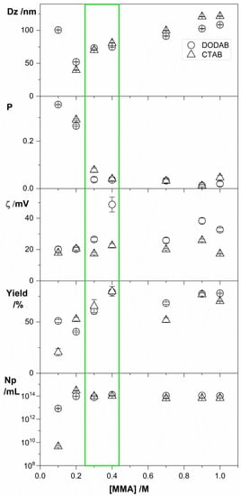 Physical properties of PMMA/QAC NPs obtained by emulsion polymerization over a range of [MMA] at 2 mM DODAB (○) or CTAB (∆). All dispersions were exhaustively submitted to dialysis in pure water before measurements. Above 0.4 M MMA, poor colloidal stability was depicted from the visual observation of precipitated material; the measurements were performed with the dialyzed supernatants. Below 0.3 M MMA, low MMA concentrations resulted in low conversion (yield %), high polydispersities (P), and comparatively low zeta-potentials (ζ). The green rectangle indicates the region of [MMA] yielding stable PMMA/QACs NPs at high conversion rates, maximal particle number densities (Np), low P (0.03–0.06), high ζ (20–50 mV), and low Dz (70–75 nm).