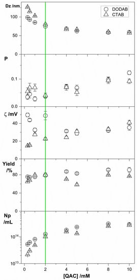 Figure 3 showed the desired properties for the PMMA/QAC dispersions at 2 mM QAC (green line), which was the concentration selected for the evaluation of antimicrobial activity. At 2 mM DODAB or CTAB, there was low size, low polydispersity, high zeta-potential, high yield, high Np and good colloidal stability for the PMMA/QAC NPs.