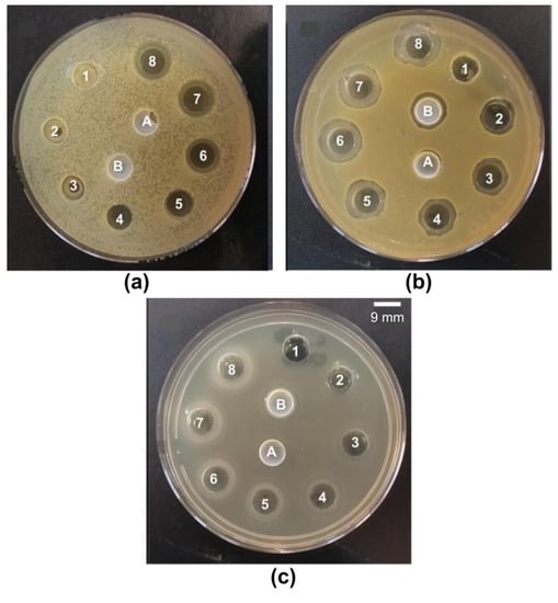(a) E. coli, (b) S. aureus, and (c) C. albicans inhibition halos induced by CTAB alone (numbered from 1 to 8) or by PMMA/CTAB dispersions after (A) or before dialysis (B). From 1 to 8, [CTAB] inside the wells was 0.01, 0.2, 0.3, 0.5, 1.0, 1.5, 2.0, and 2.5 mM.