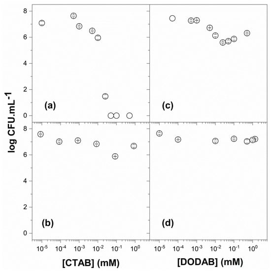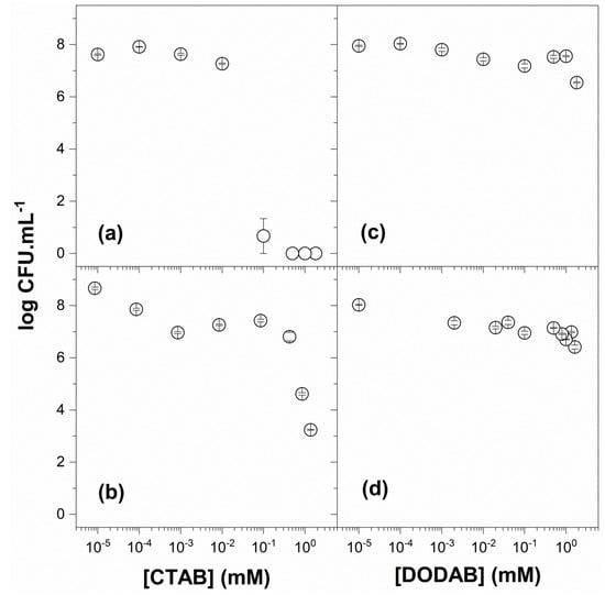 Viability of Escherichia coli in the presence of CTAB (a), PMMA/CTAB (b), DODAB (c), and PMMA/DODAB dispersions (d). The NP dispersions of PMMA/CTAB and PMMA/DODAB were used after dialysis. The counting of colony-forming unities (CFU) was expressed on a logarithmic scale.