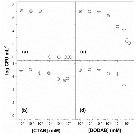 Figure 5 shows the cell viability of Escherichia coli in the presence of CTAB (a), PMMA/CTAB NPs (b), DODAB BF (c), and PMMA/DODAB NPs (d). Just after dialysis, the inhibition halo experiment yielded an absence of free CTAB in the supernatant of PMMA/CTAB NPs and 1.7 mM CTAB in the NPs. This [CTAB] initially incorporated in the NPs decreased E. coli viability by 1.5 logs (Figure 5b), in contrast to free CTAB that reduced viability by 7 logs (Figure 5a). CTAB exhibited a remarkable activity against E. coli that could not be identified before from experiments expressing only % cell viability (limited to only 2 logs at most). CTAB incorporation in the PMMA/CTAB NPs reduced substantially its activity but may be useful for controlled release in biomedical prosthetic devices [63] or agar-based hydrogels [64].