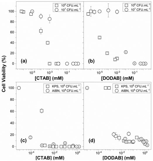 Candida albicans viability (%) (○) over a range of CTAB (a) or DODAB concentrations (b) in QAC dispersions in water as compared to data from [31] (□). Staphylococcus aureus viability (%) (○) over a range of CTAB (c) or DODAB concentrations (d) in the presence of PMMA/QAC NPs, as compared to data from [27] (□). QAC dispersions in water are CTAB micelles or DODAB BF. In (c,d), PMMA/QAC NPs were obtained by the emulsion polymerization of MMA in the presence of QACs. These NPs were obtained either using AIBN (○) or KPS (□) as the initiator. [MMA] and [QAC] used during particle synthesis were 0.56 M and 4.0 mM, respectively, for squares in (c), 0.4 M and 2.0 mM, respectively, for circles in (c,d), and 0.56 M and 10 mM, respectively, for squares in (d).