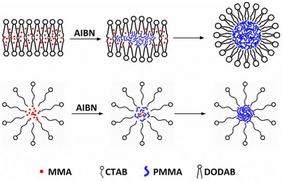 Emulsion polymerization of methyl methacrylate (MMA) initiated by azobisisobutyronitrile (AIBN) using dioctadecyl dimethyl ammonium bromide (DODAB) or cetyltrimethylammonium bromide (CTAB) as emulsifiers. The cross sections of DODAB bilayer fragments (BF) and CTAB micelles were schematically represented as loaded with the MMA monomer (in red) before adding AIBN to initiate the polymerization.