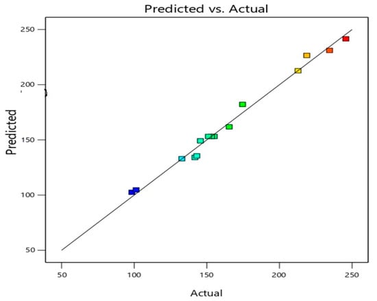 Predicted versus actual values of the vesicle size of different experimental runs of ICA-phytosomes.