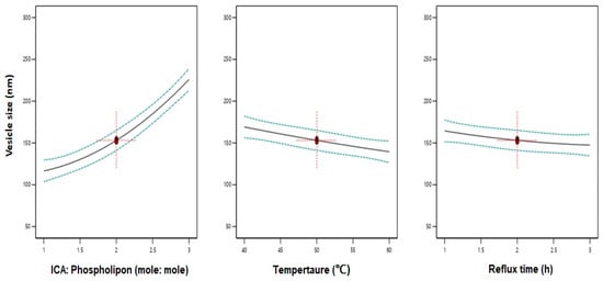 Data analysis using ANOVA showed a significant effect of the linear terms X1 (ICA:Phospholipon® 90H), X2 (temperature), and X3 (reflux time) on the vesicle size at p < 0.05 (Table 3). In addition, the quadratic term X12 corresponding to ICA:Phospholipon® 90H molar ratio was significant at the same significance level. Figure 2 shows the effects of the independent variables on the vesicle size. A negative slope was observed for both variables X2 and X3 indicating an inverse relationship between the variable and the response. A positive slope was observed for the variable X1 confirming that a higher ICA to phospholipid molar ratio causes an increase in the vesicle size. The positive sign of the linear term X1 and the negative sign of the linear terms X1 and X3 confirms the observed trend.