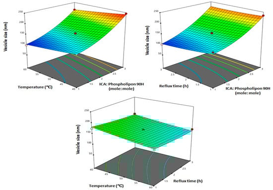 Three-dimensional (3D) surface plots for the effect of ICA:Phospholipon® 90H molar ratio (X1), temperature (X2), and reflux time (X3) on the vesicle size of ICA-phytosomes.