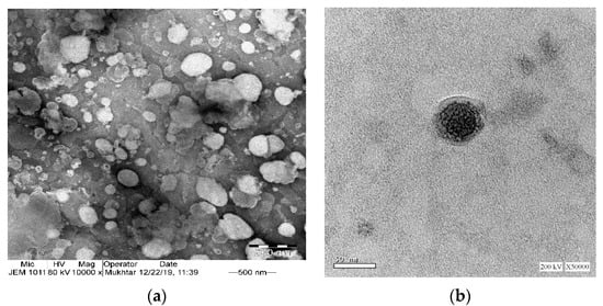 TEM micrographs of phytosomes (Figure 4a) further confirmed the particle size analysis result obtained by the dynamic light scattering technique. The particles appeared nearly spherical in shape. TEM images show some sort of aggregation of the phytosomes that could be attributed to the relatively low zeta potential value of −5.6 mV; the generally accepted value of ±30 mV is required for a stable system []. Successful phytosomal systems with low values for zeta potential were previously described []. In Figure 4b, placebo-phytosomes provide evidence of vesicle formation, displaying a uniform, spherical shape with smooth outer surfaces and with little or no signs of agglomeration.