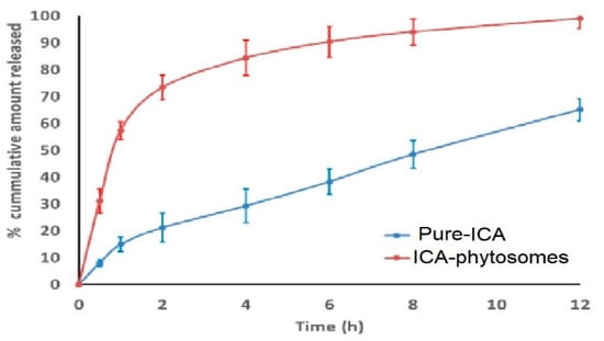 The in vitro dissolution profile of pure-ICA and optimized ICA-phytosomes is shown in Figure 6. It was evident that phytosomes could enhance the dissolution of ICA. Although a burst release of ICA was observed in both profiles, the release was much higher from the phytosomes formulation. After 2 h, around 70% of ICA was released from phytosomes, whereas the release of the pure drug was around 20% only. Thus, at 2 h, the drug release was more than double from the phytosomes as compared to the pure drug. At the end of 12 h, ICA release was almost complete from phytosomes compared to pure-ICA release of only 65%.