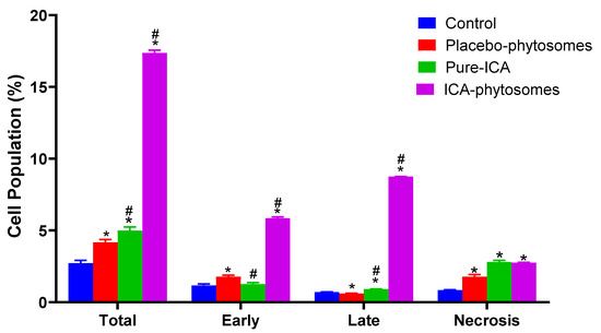 Annexin V-FITC apoptosis detection kit was used to study the apoptosis determination by flow cytometry. Figure 8 shows that ICA-phytosomes exhibited a distinct and much higher early, late, and total cell apoptosis as well as necrotic cell death when compared with other treatments (Figure S2, Supplementary Materials).