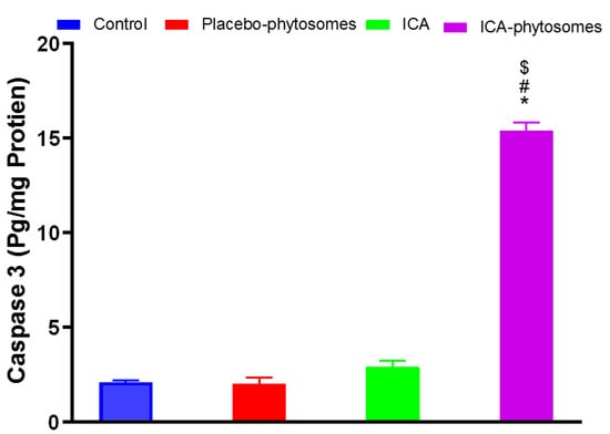 Effect of ICA-phytosomes on caspase-3 content in OVCAR-3 cells. * Significantly different from control at p < 0.05, # significantly different from placebo-phytosomes at p < 0.05, $ significantly different from pure-ICA at p < 0.05.