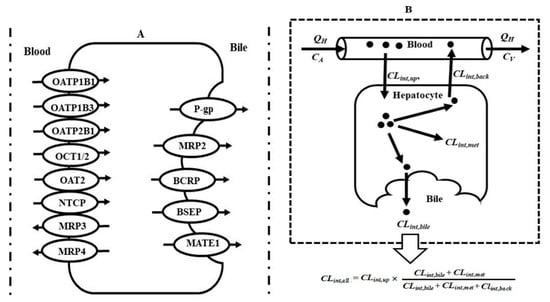 In the liver, drugs enter hepatocytes from portal blood through passive diffusion or transporter-mediated transport. In hepatocytes, drugs are metabolized by metabolic enzymes. Parent drugs and their metabolites are pumped out of hepatocytes to bile through efflux transporters (such as P-gp, BCRP or MRP2) and are exported to the blood through passive diffusion or efflux transporters (such as MRP3 and MRP4) (Figure 1B). Typical examples are statins. Most statins are substrates of CYP450s, MRPs, OATPs, BCRP and P-gp, characterizing transporter–enzyme interplay. The overall hepatic intrinsic clearance (CLint,all) is a hybrid parameter which is composed of intrinsic influx clearances (CLint,up) from portal blood, intrinsic metabolism clearance (CLint,met), biliary excretion clearance (CLint,bile) and intrinsic efflux clearance (CLint,back) of unbound drugs from hepatocytes to the blood, i.e.,