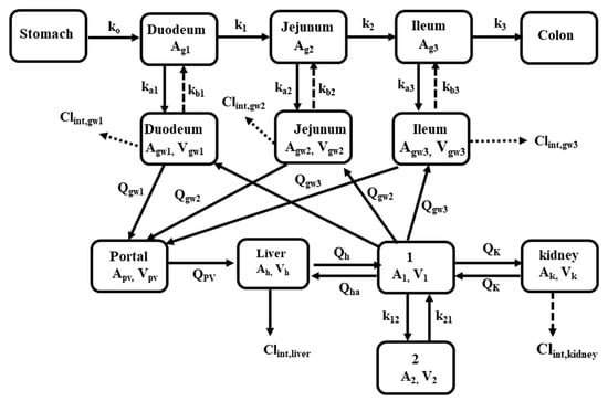 Schematic diagram of semi-physiologically based pharmacokinetic model (PBPK) model describing the pharmacokinetics of verapamil and furosemide in rats. Ai, Qi and Vi indicate drug amount, blood flow and volume in corresponding compartment, respectively. ki, ka,i and kb,i represent the transit rate constant, drug absorption rate constant and efflux rate constant from enterocytes to the gut lumen, respectively. Clint,gwi, Clint,liver and Clint,kidney mean the intrinsic clearance in enterocytes, hepatocytes and kidney, respectively.
