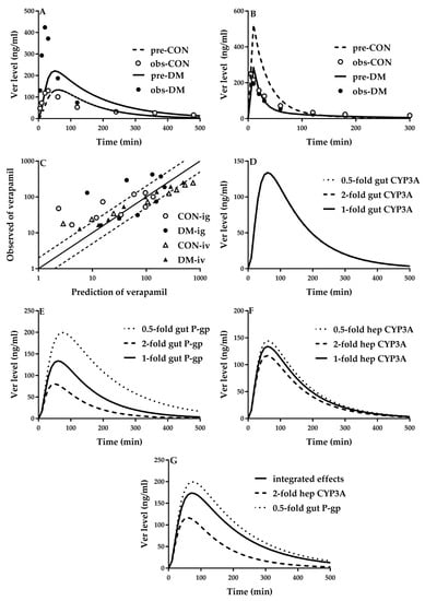 Observed (point) and predicted (line) plasma concentrations of verapamil (Ver) following (A) oral (10 mg/kg, ig) and (B) intravenous dose (1 mg/kg, iv) to diabetic rats (DM) and control rats (CON); (C) comparison of mean observed and predicted plasma concentrations of verapamil at each time point; (D) individual contributions of altered hepatic CYP3A, (E) intestinal CYP3A and (F) intestinal P-gp to oral plasma exposure of verapamil as well as (G) their integrated effects. The observations were obtained from the literature [27].