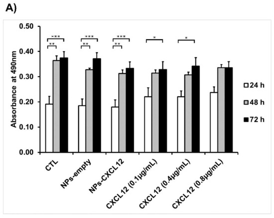 Furthermore, in the present study, the MTS assays did not reveal any significant effect of CXCL12 (free at 0.1, 0.4, or 0.8 µg/mL, or entrapped in the NPs) on the mitochondrial enzymatic activity in F98 cells in comparison to the untreated cells (CTL) after incubation for 24 h, suggesting that there was no cytotoxic effect of this chemokine or Alg/Chit NPs. Another experimental approach using live/dead cell staining assays confirmed these observations. Interestingly, the mitochondrial enzymatic activity in F98 cells incubated in the presence of Alg/Chit NPs without CXCL12 at 48 or 72 h was also similar to that observed in untreated cells, suggesting that the NPs alone did not promote the F98 cell proliferation. Indeed, we previously found that the Alg/Chit NPs alone can slightly enhance the proliferation of human neuroblastoma cells [10]. The proliferation of F98 cells at 48 or 72 h was also similar with or without CXCL12 (free or entrapped in NPs) treatment. However, several studies have shown that CXCL12 can increase the proliferation of GBM cells [41,52]. These apparent controversial results may be due not only to the different origins of the cells but also to the CXCL12 dose. For example, the proliferation of human U87-MG GBM cells was significantly increased in a dose dependent manner by human CXCL12 after incubation for 24 h, as shown by [3H] thymidine incorporation. Nevertheless, CXCL12 at a concentration of 12.5 nM, induced a higher DNA synthesis than at 50 nM [52]. In the same way, using [3H] thymidine incorporation, Bajetto et al. found that CXCL12 at 100 ng/mL promoted the proliferation of primary GBM cells obtained from a woman (36 years old), while it prevented it at 200 ng/mL [41]. In contrast, the proliferation of primary GBM cells obtained from a man (63 years old) was increased at 200 ng/mL [41]. These observations confirmed the importance to design a versatile CXCL12 delivery system.