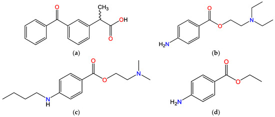 Chemical structures of the investigated molecules: (a) ketoprofen (KET), (b) procaine (PRO), (c) tetracaine (TET) and (d) benzocaine (BEN).