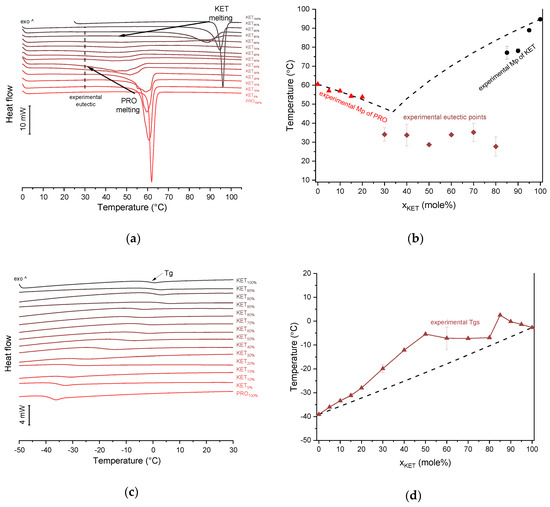 Thermal analysis of KET-PRO systems: (a) DSC thermograms from first heating; the broken line indicates the position of the eutectic peak while the arrows show the position of the melting peaks, (b) phase diagram based on thermal analysis of first DSC heating; the broken lines show the theoretical liquidus curves calculated using Equation (1), (c) DSC thermograms from second heating (the samples were first heated to 110 °C at 10 °C/min, quench cooled at a nominal cooling rate of 300 °C/min and reheated at 10 °C/min) (d) phase diagram based on thermal analysis of second DSC heating; the broken line shows the theoretical Tg values calculated using Equation (2). For plots (a) and (c) the subscript indicates the content of the named component in mole%.