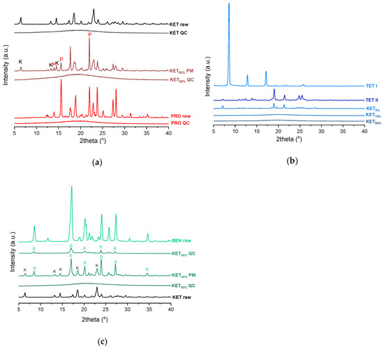 PXRD of: (a) KET, PRO and equimolar KET-PRO mixtures; (b) KET, TET and KET-TET mixtures; (c) KET, BEN and KET-BEN mixtures. QC-quench cooled, PM-physical mixture, raw-as supplied, TET I-TET polymorphic form I, TET II-TET polymorphic form II. The subscript indicates the KET content in mole%.